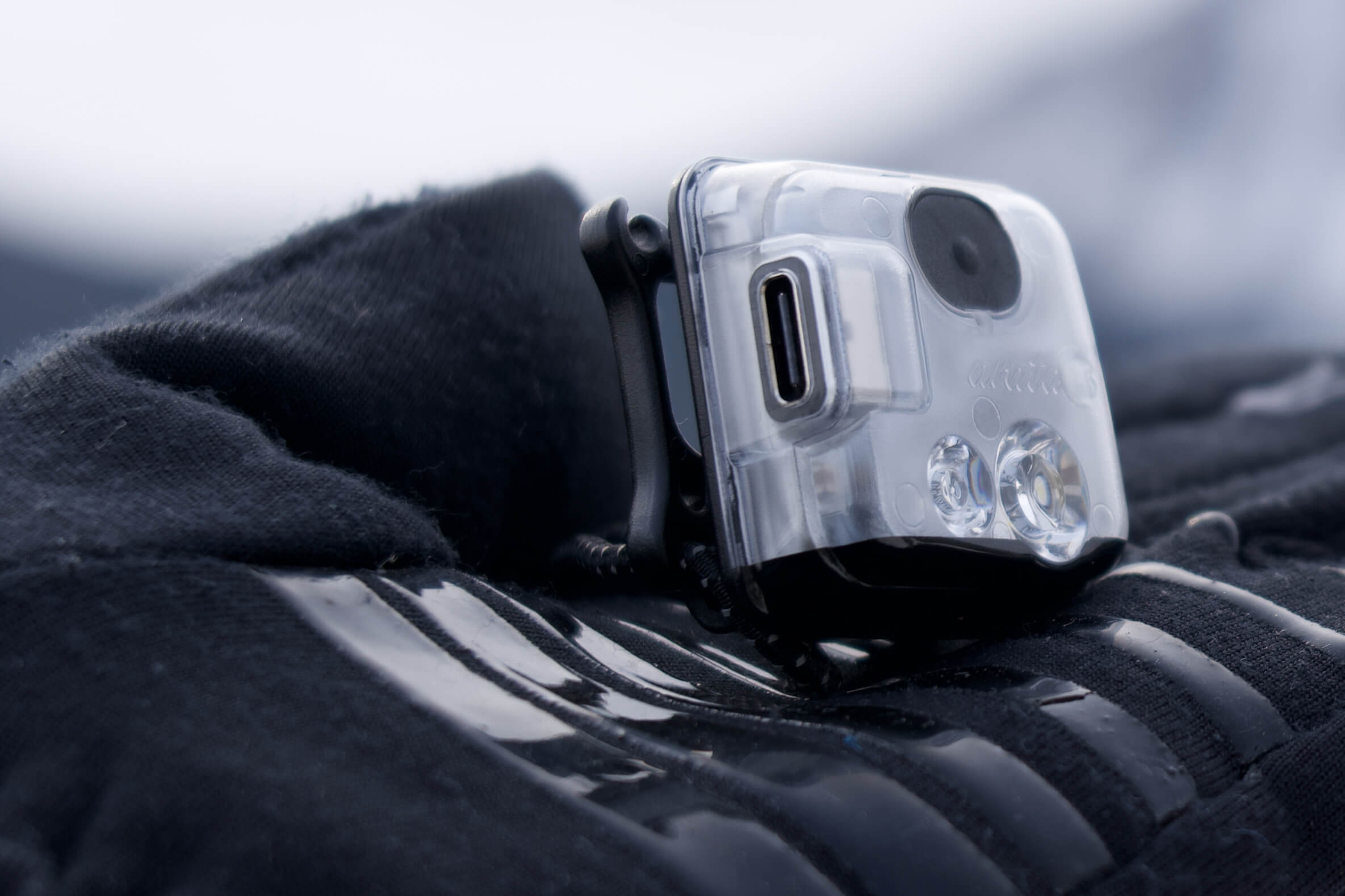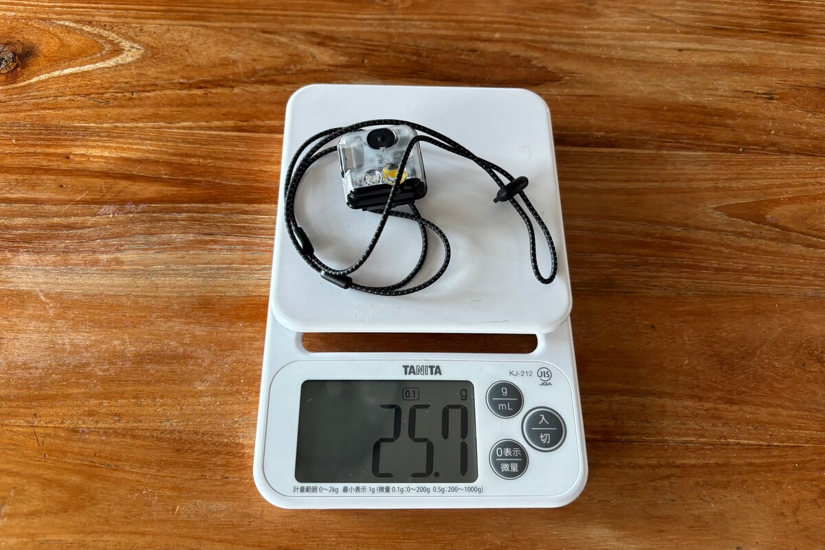 本体とバンドを合わせても24g。実測値で25.7gです。ヘッドランプとしては間違いなく最軽量クラスですが、この軽さは単に装備が軽くなるだけではありません。ヘッドランプが軽いことによるアドバンテージは装着している時間が長くなればなるほど大きくなります。出力の大きなヘッドランプはその出力を維持させるためにバッテリーを大きくしたり、点灯中に発する熱を処理するためにボディが大きくなることに比例して本体重量も重たくなります。いくつかのヘッドランプを調べてみると、一般的なモデルは80g〜120gほどであることが多く、さらに高出力なモデルになると重量を分散させるためバッテリーを後頭部に配置するモデルもあります。たかが100gであっても長時間装着していれば当然疲労してきます。