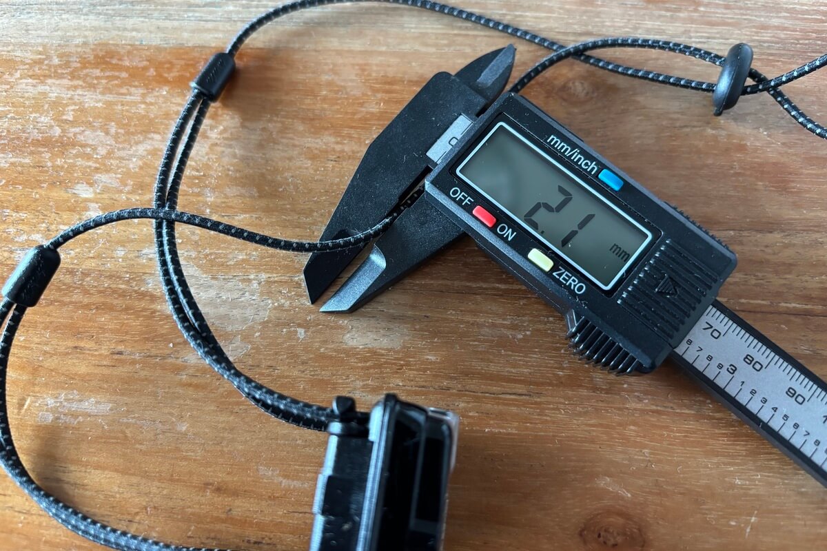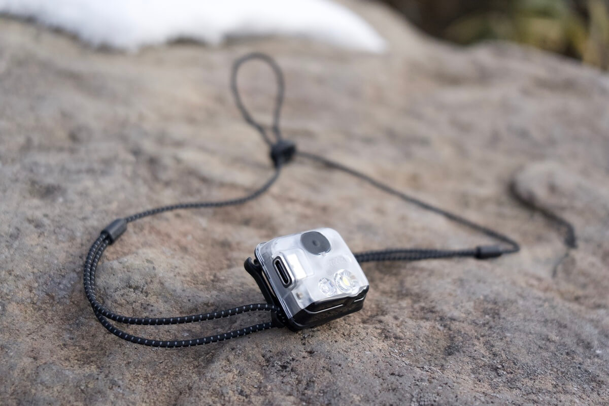 極限まで軽量な仕様になっているため、バンドは約2.1mm(実測値)のバンジーコードが使われています。頭に直接装着する場合、ズレないようしっかりと固定すると細いバントが喰い込みます。自分は基本的にキャップの上から装着したり、フードの上から装着するため気になりませんでしたが、頭部に直接取り付ける人は注意が必要です。