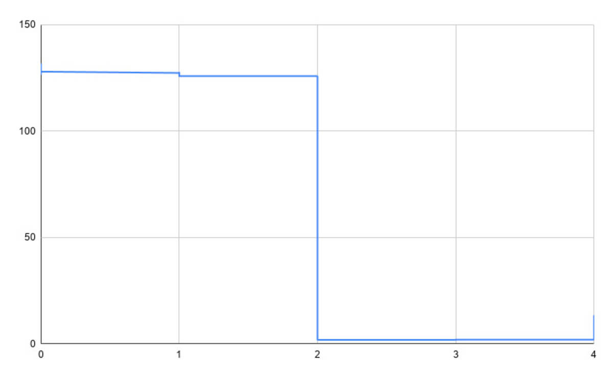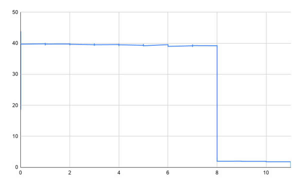 まず光源から約1m離れた壁に設置した照度計で計測された明るさ(単位はルクス)を10秒おきに計測したグラフを見てみます。