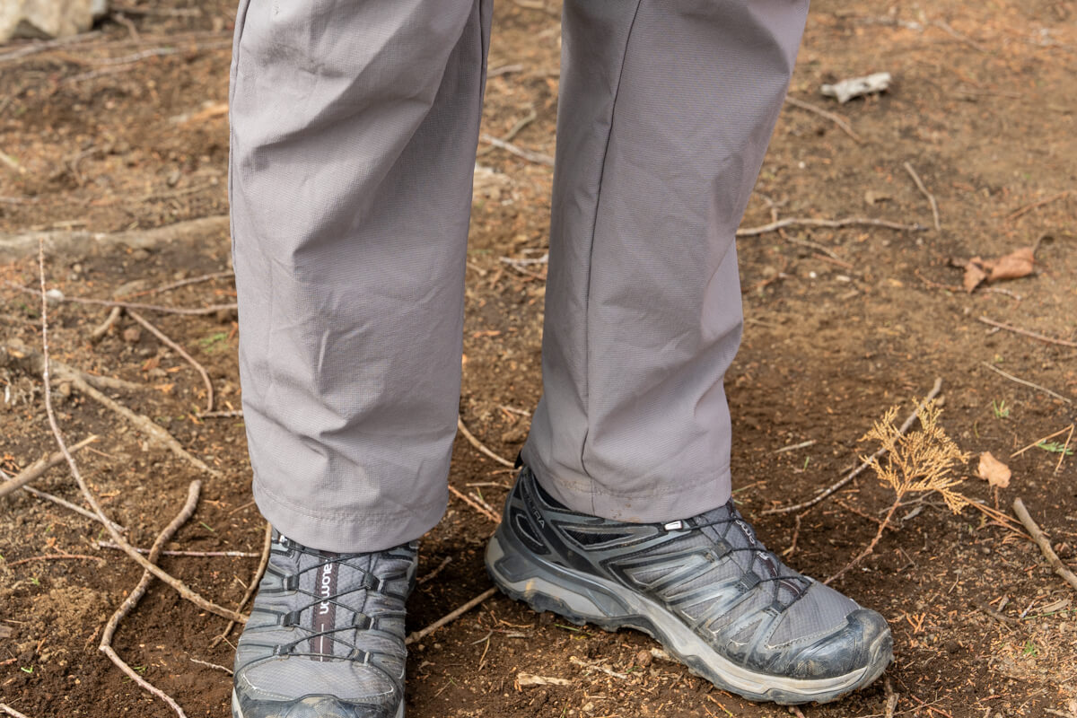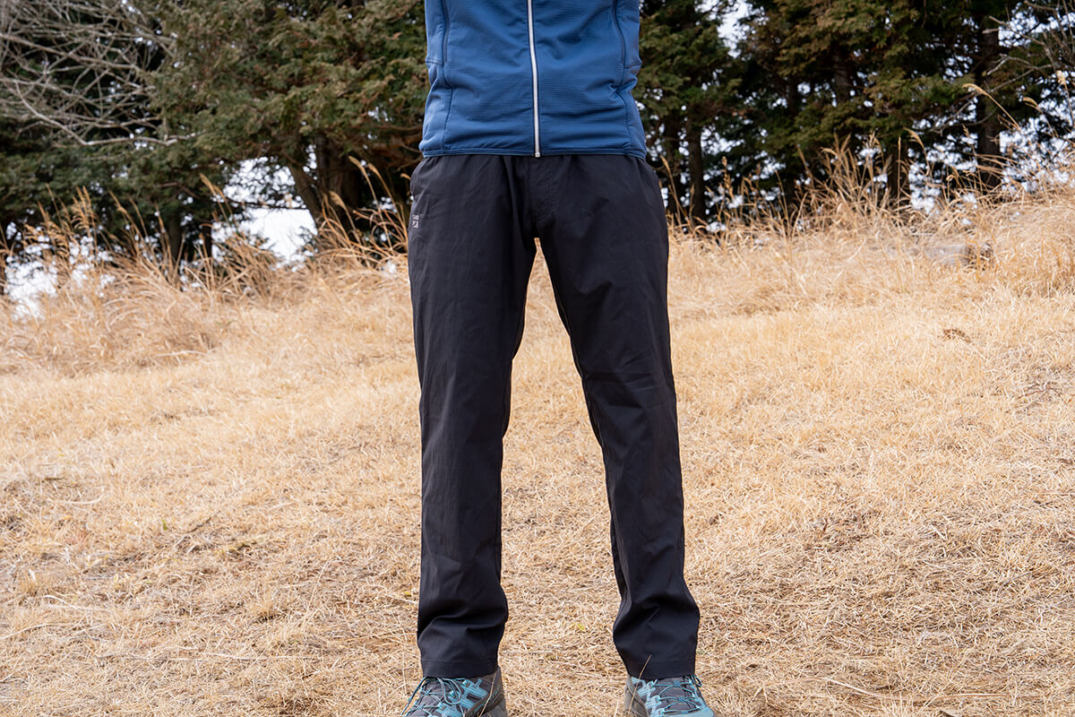 足元はミドル・ハイカットのブーツと組み合わせてもすっぽりとカバーする裾の広さがあり、その点では本格登山に使いやすく感じました。ただ逆に裾を絞りたいと思った時にどうしようもないので、個人的には裾幅を調節して締めたりできると、バタつき感を抑えたり、裾を上げて固定したりできてより使い勝手がよくなった気がします。