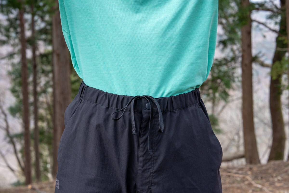 またウエストの調整にバックルではなく「紐」を採用しているため腰回りがフラットに保たれ、バックパックのヒップベルトを締めてもバックルが当たって痛くなることがありませんでした。ハイキングなどフィールドでの行動中にはありがたい仕様ですが、個人的にはここはより街でも使いやすいようにベルトループも付けるなどして欲しかったところです。