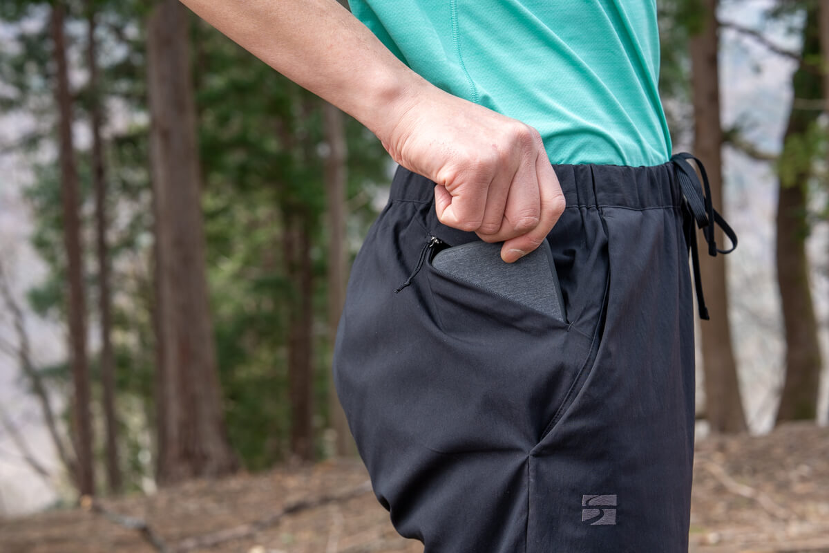 細かなパーツ類でも、シルファのストイックな方向性とは違ってどちらかというと平常時での「利便性」を重視している点が感じられます。右後ろに配置された「スマートフォンポケット(ファスナー付き)」がそれで、この位置にポケットがあることで歩行中には揺れにくく、また前後を避けているので座るときに邪魔になることもありません。個人的には普通に本格トレッキングパンツにあっても全然いいと思えるほど便利でお気に入りのポケットです。