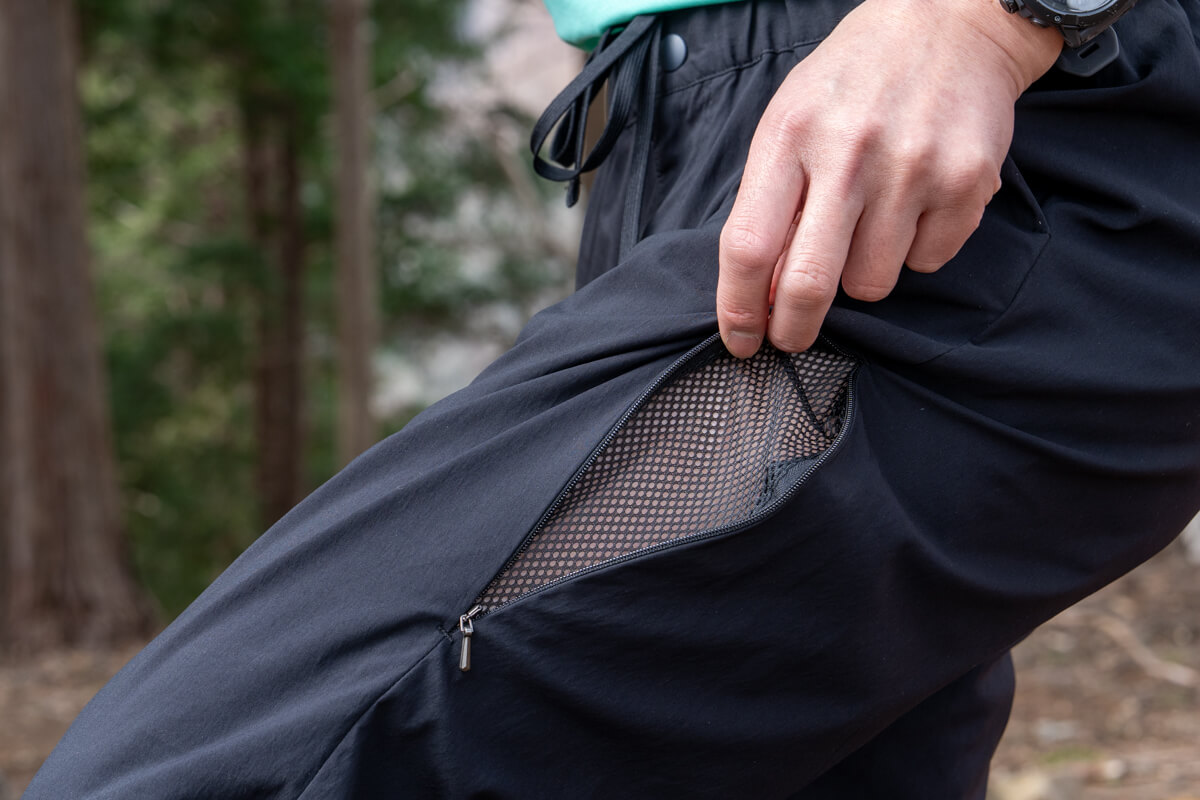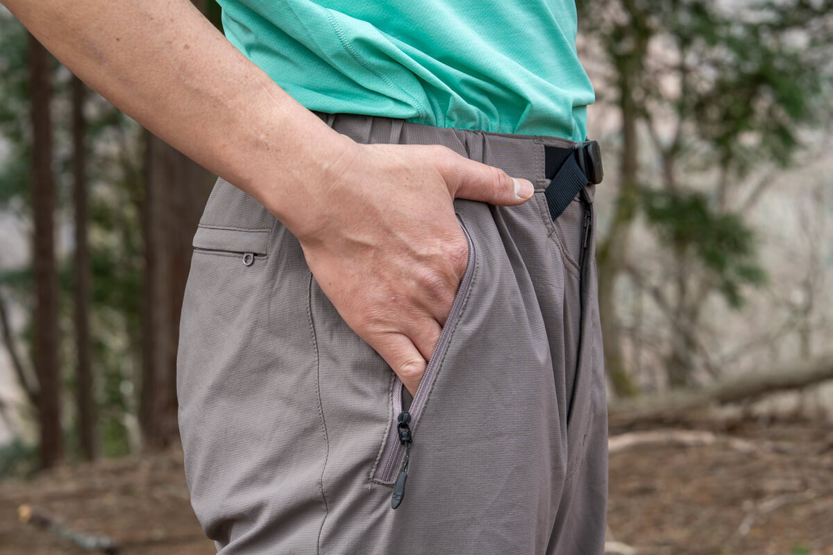 使い勝手や調節性を左右する各種収納・パーツ類はいたってシンプルですが必要な要素がしっかりと盛り込まれているという印象。本格アウトドア用としては欠かせない、ジッパー付きポケット(左右と右ヒップ。ヒップポケットはMen’sのみ)を備え、中の小物が落ちにくいようになってたり。
