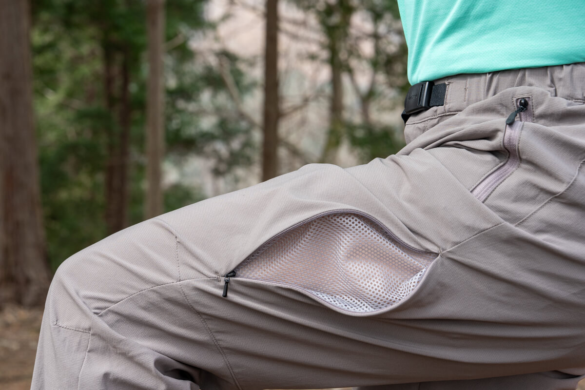 ここまででも十分素材によって高い通気・速乾性を実現しているところで、さらにこのパンツにはファイントラック独自のベンチレーションシステム「リンクベント」が、特に夏仕様にチューニングされて搭載されているため、蒸れの解消をさらに加速してくれます。夏仕様のリンクベントはメッシュの孔がいつもより大きめに作られているため、換気性能も従来に比べて抜群に高いです。正直ロングパンツにもかかわらず短パンと変わらないほどの抜けの良さが感じられました。