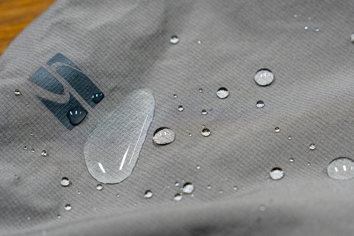 この生地には薄手で通気性の高い生地でありながら、100回洗濯しても80点以上の撥水性能を維持する「100洗80点」の優れた耐久撥水加工が施されています。これにより、急なにわか雨や朝露はもちろん、少々の雨ならば弾いて濡れや冷えを防ぐだけでなく、泥汚れなども付きにくく、そしてそもそも濡れにくいので乾きやすくと、厳しい山岳で安全と快適さを保つためにより効果的な性能をしっかりと備えています。夜明けから雑草の生い茂るトレイルを歩いているといつの間にか膝から下がずぶぬれということも珍しくない低山ですが、今回それに近い場所も含めて歩いてみた限りでは、足元が濡れることはほぼありませんでした。