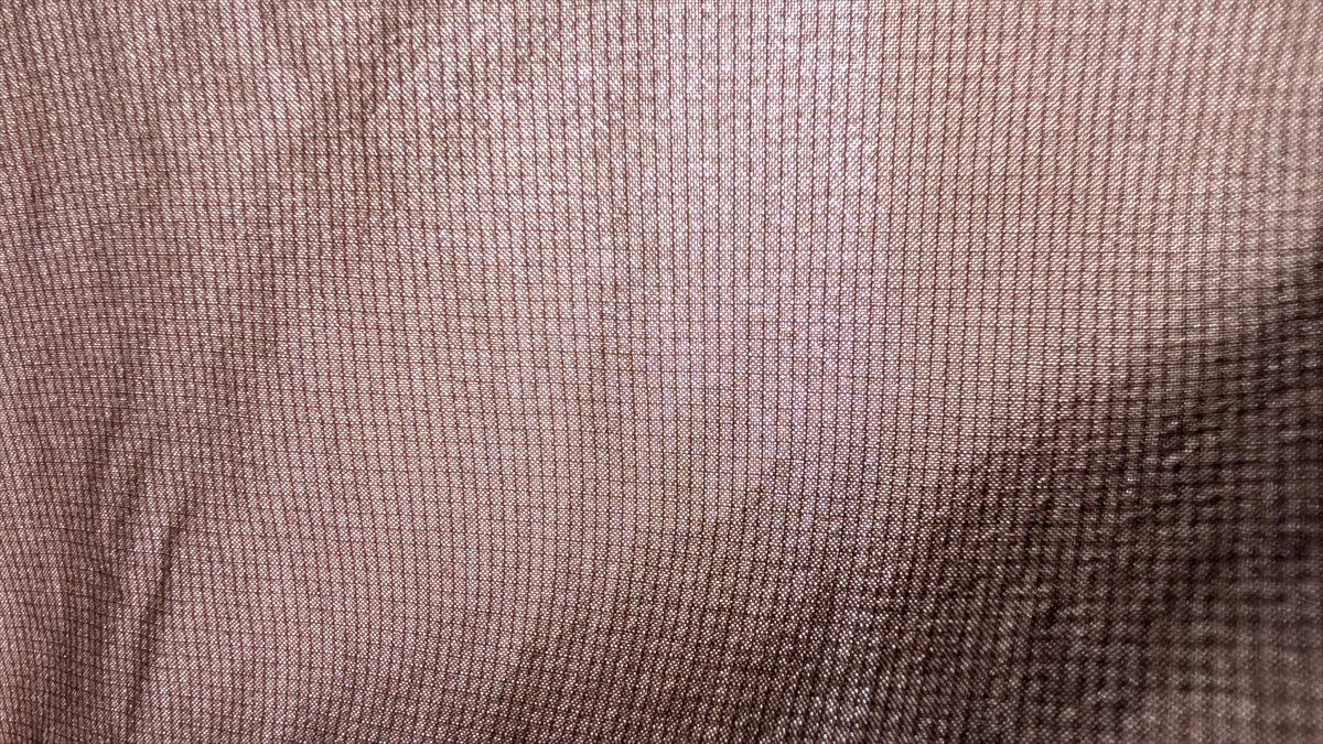 空にかざすと裏側が透けて見える程薄手の生地だが、66ナイロン素材とリップストップ構造などによって強度はこの薄さとは思えないほどしっかりとしている。