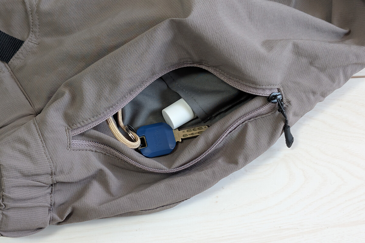 日常での使い勝手やデザイン性の観点からジッパーを配したポケット。登山などで使う際にはものを落とさないように注意が必要。