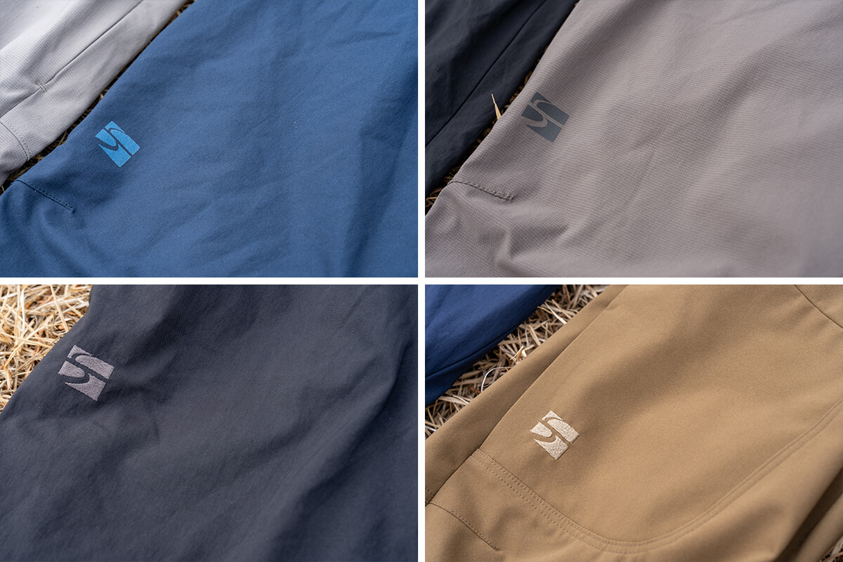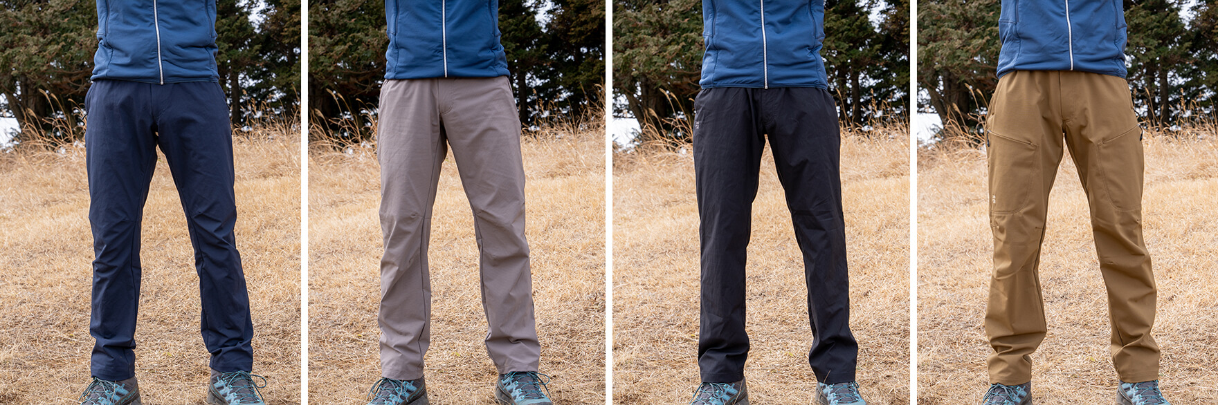 シルエットの違い(左から「カミノパンツ」「シルファパンツ」「ミヤマパンツ」「ストームゴージュアルパインパンツ」)。シルファパンツ(左から2番目)のパターンは肌に張り付きにくくするためかカミノパンツなどよりは気持ちやや太め。そしてミヤマパンツ(左から3番目)は立体パターンを控え目に、きれいなシルエットで見た目は分かりにくいがさらにリラックスした穿き心地。
