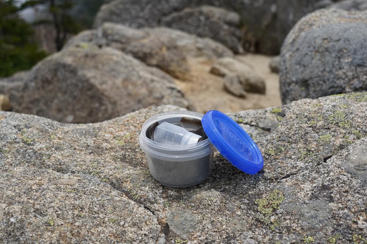 kanamari400は旭化成のZiploc(ジップロック)スクリューコンテナ473mlの中にぴったりと入ります。ジップロックのスクリューコンテナといえばシンプルな湯戻し調理を基本とするUL界隈ではお馴染みの定番アイテム。ピッタリと入るよう計算して設計されており、その証拠にkanamari400を購入するとスクリューコンテナがケースとして付属してきます。これはマスプロメーカにはできないことというか、遊び心があっておもしろいところでした。もちろんスクリューコンテナはフリーズドライ食品を食べるのに便利なため実用的ですし、限界まで薄く加工しているkanamari400の本体を保護する役割も担っていますから合理的です。