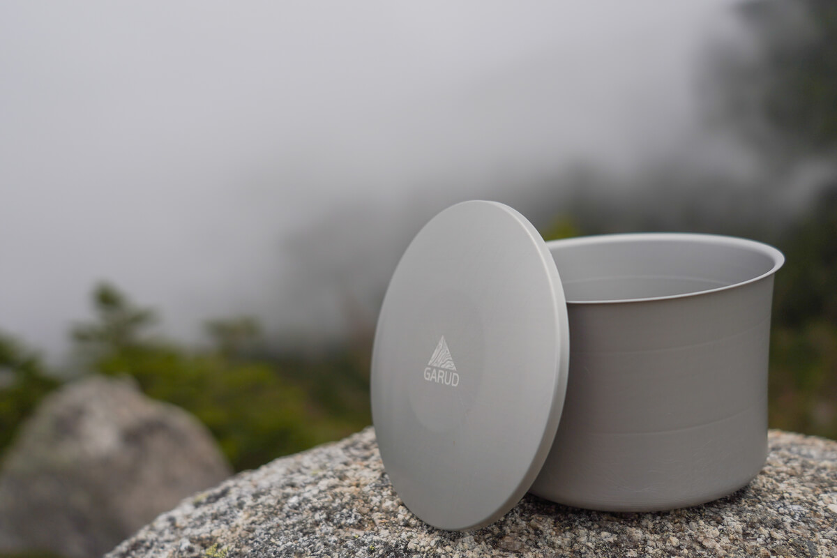 GARUD「kanamari400」は超軽量で調理のしやすい極薄アルミ合金製のリッド付きクッカー。当時「軽量ギアでのキャンプ」という自分のスタイルに合うアイテムがなかなか見当たらなかったことから「なければ自分で作ってしまおう」と開発したのがきっかけで誕生。市場に並ぶ軽量なクッカーといえば多くはチタン製ですが、kanamari400 は「超軽量でもご飯をおいしく炊きたい」というこだわりを追求し、あえて熱伝導率の低いチタンではなくアルミニウム合金を採用。限界まで薄く加工することで本体は31g、リッドは10gと極めて軽量なクッカーを実現しました。耐熱プラスチック容器「Ziploc」のスクリューロックコンテナの中に収まり、収納袋を必要とせず持ち歩くことが可能。