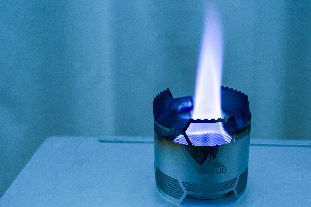 たとえば標高1500m前後、気温5℃、微風のフィールドで、ao とhizutsu の上に300mlの水を入れたkanamarini400 を載せて沸かしてみたところ、10分ほど加熱しても、熱いお湯まではいくものの完全沸騰はせず、結局燃料が尽きてしまいました。このようにao は高火力を謳う他のオープンジェット方式のアルコールストーブに比べるとどうしても最高火力は見劣りするため、あらゆる環境でのスピーディな湯沸かしに向いているとはいえません。