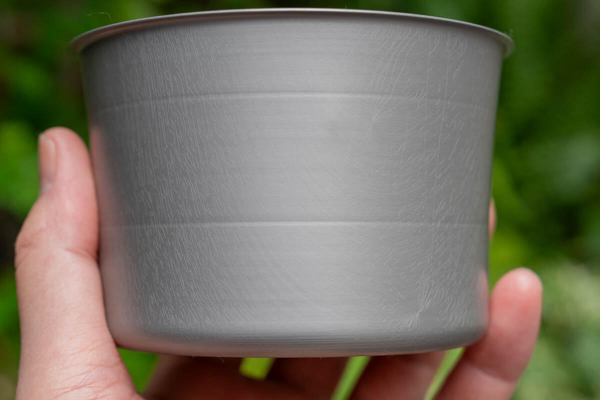 kanamari400 は見てわかる通りハンドルが付いておらず、ノンハンドルタイプのカップに同じくつまみなどのないリッドがセットになったクッカーです。容量は400ml(満水時)で、クッカーとしては最小クラス。重量はクッカーが31gにリッドが10gで合わせて41gと50gを切る軽量さ。kanamari400 と同等のサイズのカップといえば、エバニューのチタンクッカー「Ti400NH」がありますが、こちらは重さ34gと、重量だけでいえばチタンのTi400NH よりもアルミのkanamari400 の方が軽量という結果に。400mlクラスのクッカーやカップでは最軽量クラスと言えるでしょう。