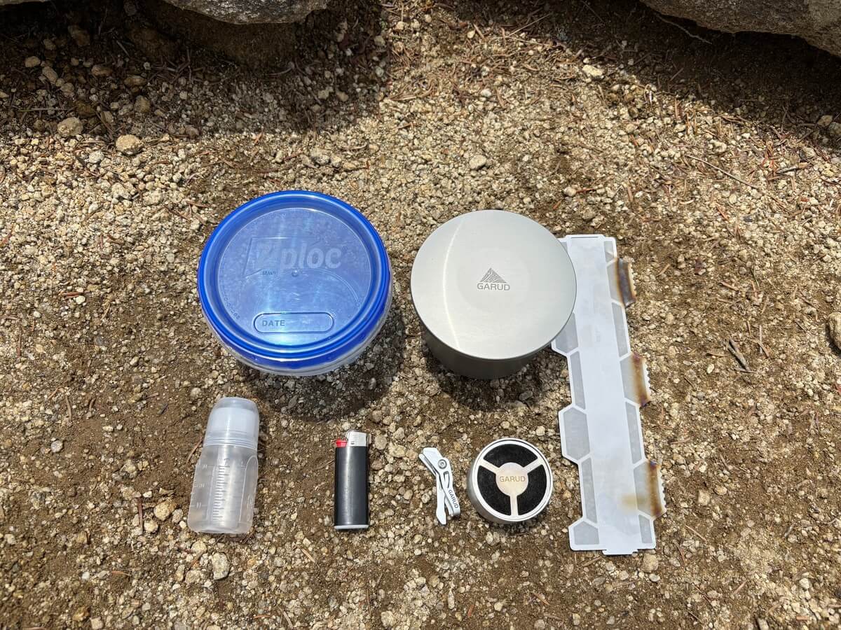 kanamari400に21gのアルコールストーブao、tsuibamiとhizutsuを合わせて重量は80g、100gを切る調理キットが完成します。そこにジップロック、ライター、燃料(30ml)を足したとしても約165.3g。さらにこれらをkanamari400の中に収容することが可能で、調理に必要なものをオールインすることが可能です(下写真)。