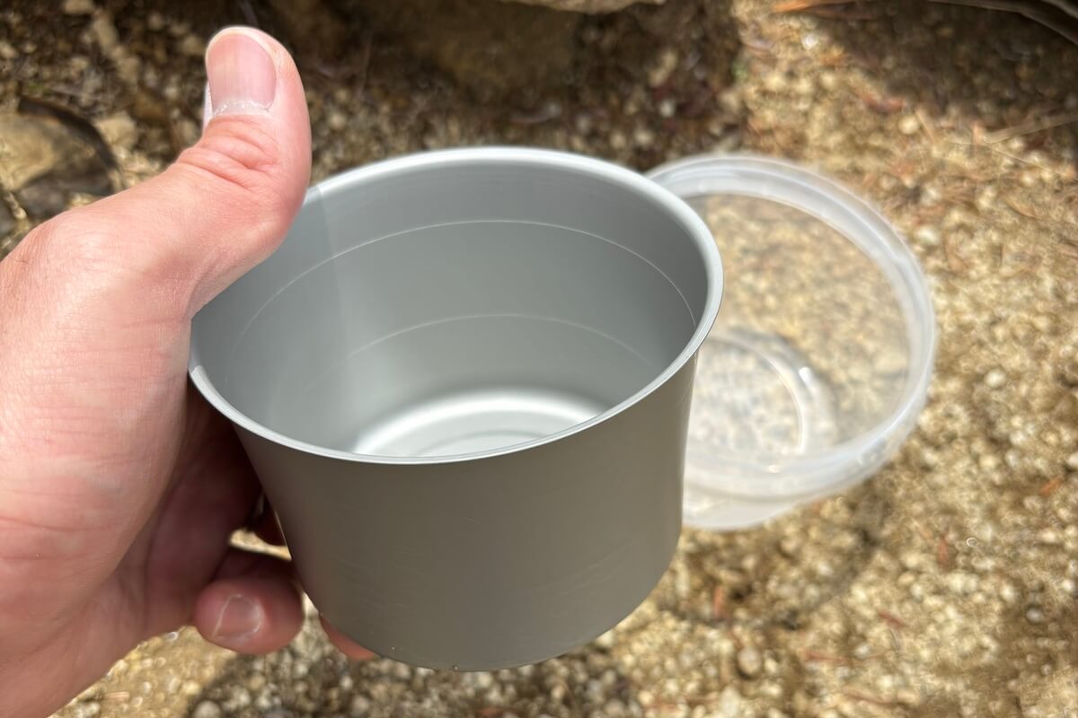 満水状態で容量が400mlのkanamari400は実用的に湯沸かしできる容量は300mlと、決して余裕のあるサイズではありません。ただ、カップヌードル1食(300ml前後)や一般的なフリーズドライ製品の1食分(150ml〜180ml)と粉末スープなどがちょうど足りる量で、1人が一食分のお湯を用意するための必要最低限はカバーしていますので、超軽量スタイルのソロハイカー用としてはこのギリギリのサイズ感こそありがたい。