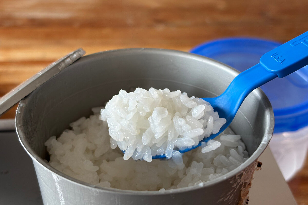 実際に1回で炊けるお米は0.5合。チタンで炊飯すると失敗の多い自分ですがkanamari400 ではふっくらと炊くことができました。容量がもう少し大きい方がいいという方には一回り大きいkanamari600 もラインナップされています。どうしてもたくさんご飯が食べたいというなら600 の方ですが、炊飯のしやすさと重量の面でKanamari400 の方が、軽量スタイルのソロハイカーにとってはよりバランスがいいと感じました。