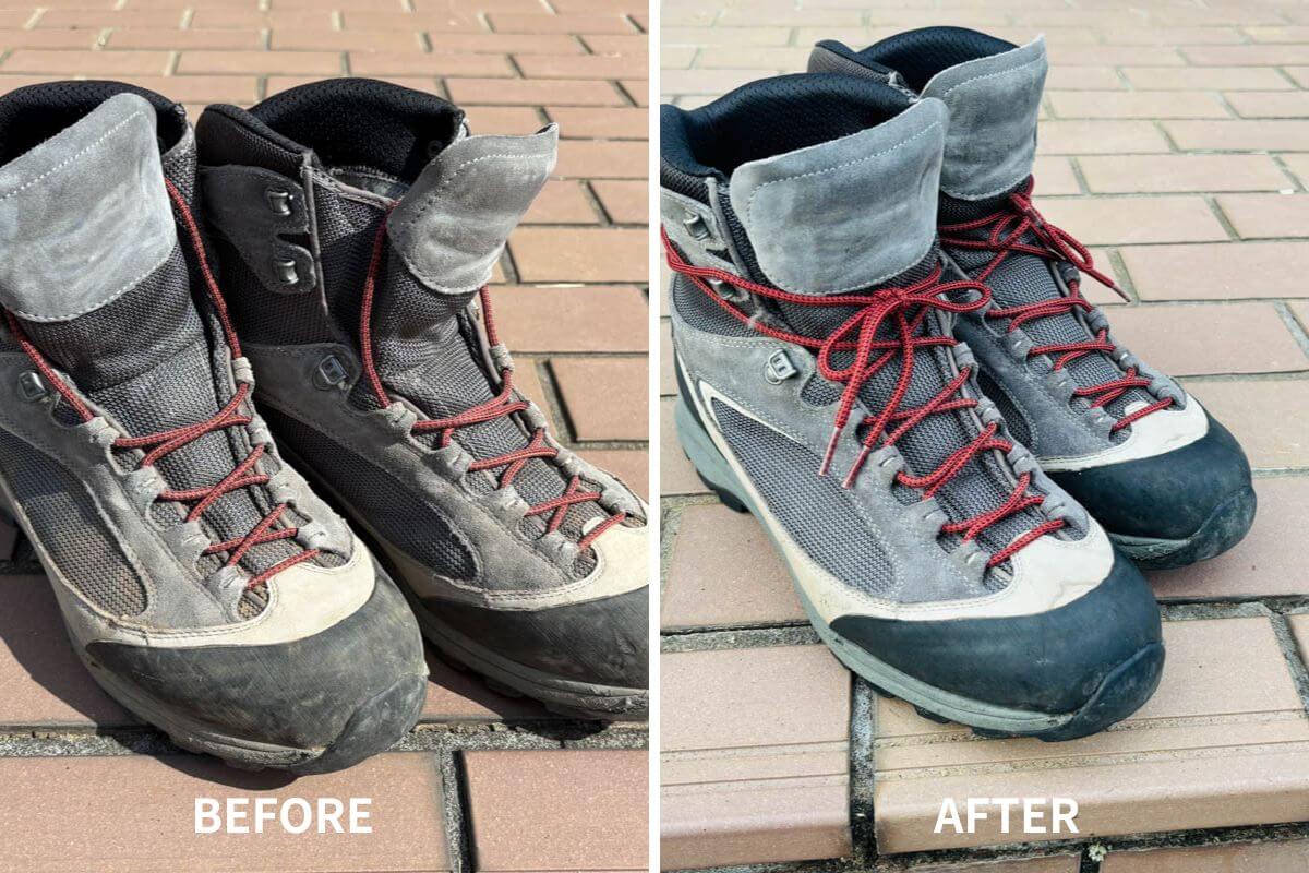 アウトドアウェア用の洗浄剤や撥水剤はツンとした臭いのするものもあり、少し苦手意識がありましたが、グランジャーズのフットウェア + ギアクリーナー&フットウェア リペル プラスは鼻を刺すような臭いもなく使いやすかったです。作業時間としては1足で30分ほどでした。この作業、難しいことは一切ありませんでしたが、手間がかからないかというとそうは思いませんでした。簡単とはいえ手間はかかります。ですがこの手間は道具を長持ちさせるために必要な作業であり、登山を楽しむのであれば身につけておくべきことだと感じました。