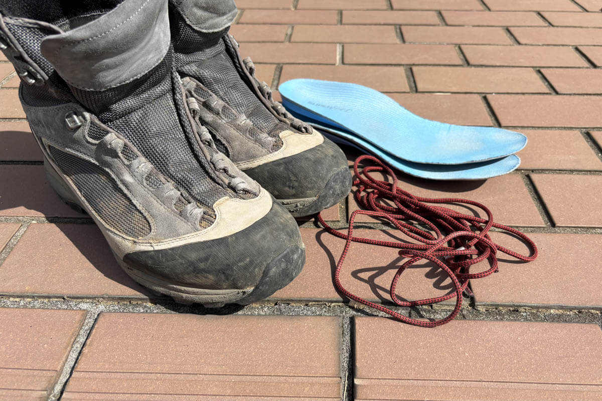 一回の山行において最も汚れやすいのが登山靴。使用するたびにシューレースを外し、ケアをするのは考えただけでもめんどうに感じますが、こうやってメンテナンスをすることはただ汚れを落とすだけでなく、シューズの異変をチェックすることもできます。筆者が今回ケアを行なった登山靴は5年以上履き込んだ登山靴ですが、ソールのつま先部分が剥がれ始めていることに気づくことができました。