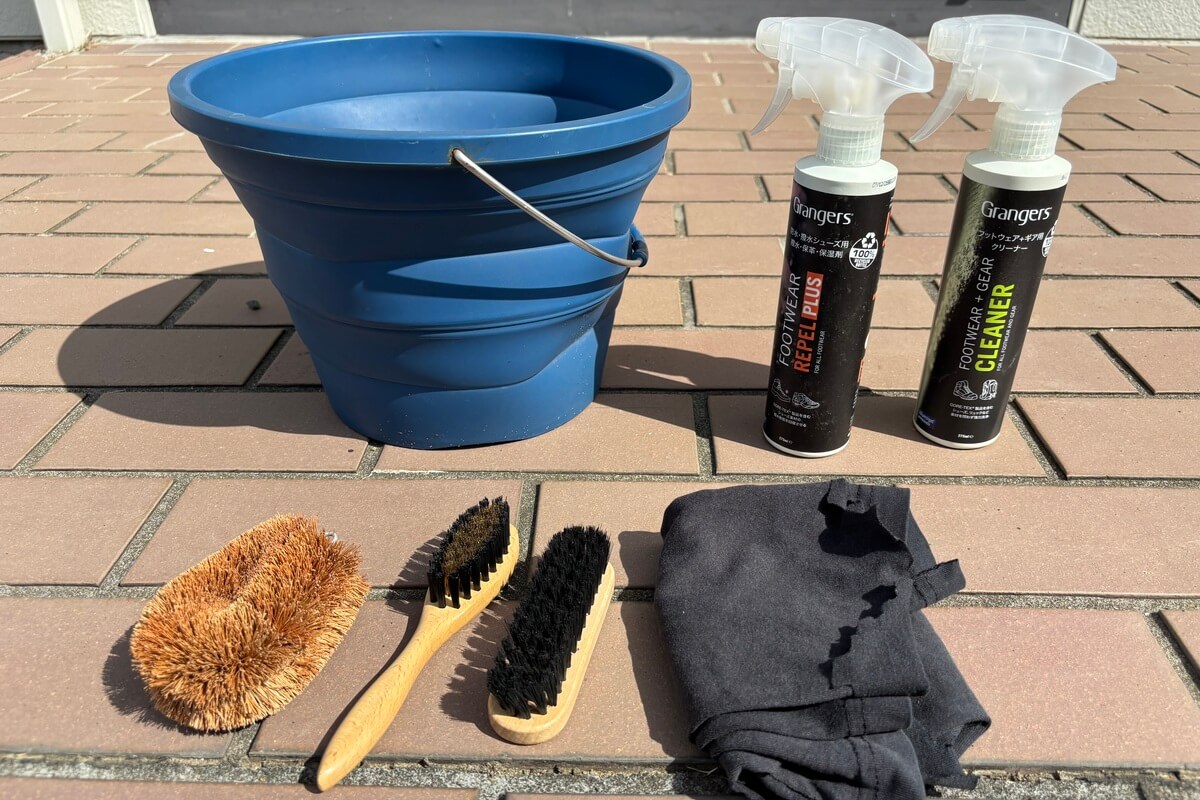 これまでは靴底の泥汚れを落とし、軽くブラシをかける程度で済ませていた筆者ですが、今回初めてしっかりとしたシューズケアにトライしました。メンテナンス前と後では見違えるほどきれいになった登山靴。撥水性能も復活しました。メンテナンスにあたって用意したものはバケツ、ブラシ、雑巾(着古した綿のTシャツ)です。