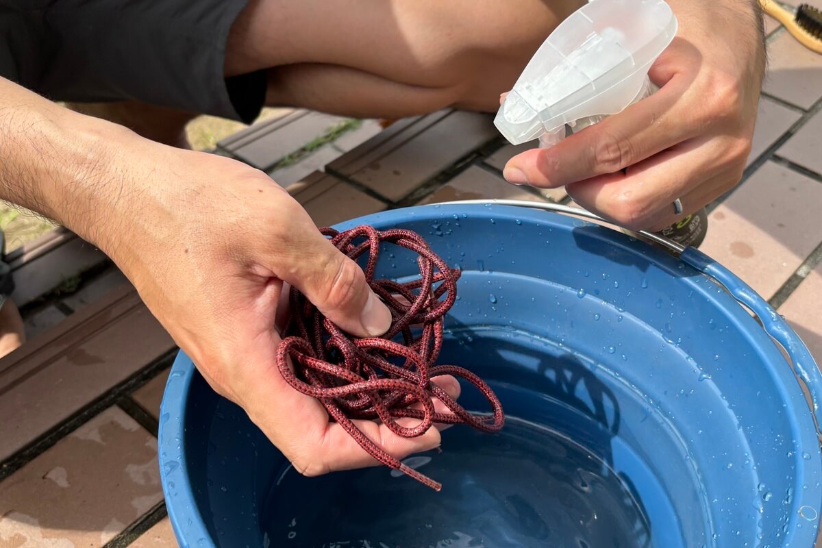 シューレースも洗浄可能。クリーナーを吹きかけて揉み込むと泡立つのでよく洗いすすぎます