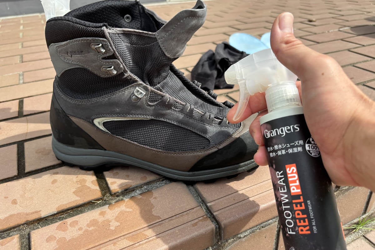 洗浄後はフットウェア リペル プラスを使って撥水加工を施していきます。洗った後に一旦乾かして、それから撥水加工となるともう1日がかりの作業になりますがフットウェア リペル プラスは水性のため、洗浄後の濡れたまま撥水加工の作業をしてOK。フットウェア + ギアクリーナーと同様に15cmほど離したところから全体に吹きつけていきます。乳白色の液体のため、シューズ表面に馴染まない分は拭き取ります(拭き取らないとシミなどの原因になりうるので注意)。シューレースにも同じく吹きつけておきます。