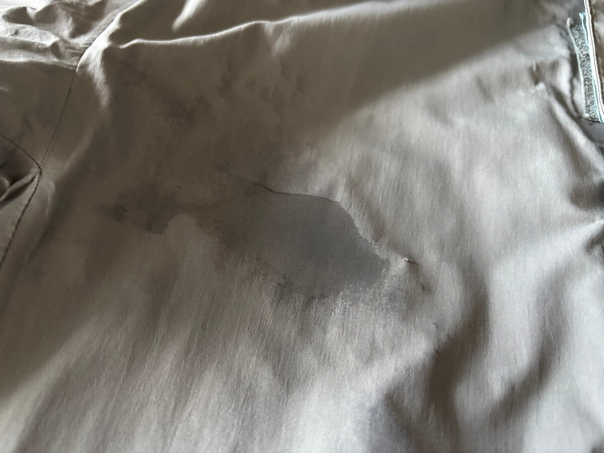撥水性能が低下した状態。水分が生地に残ってしまうことで透湿性能も低下してしまう