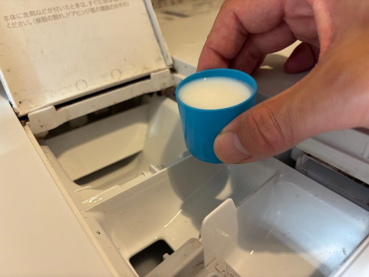 筆者の使う洗濯機はドラム式のため、上部の洗剤投入口から洗剤を入れます。縦型の洗濯機の場合は洗濯槽に直接入れてOK