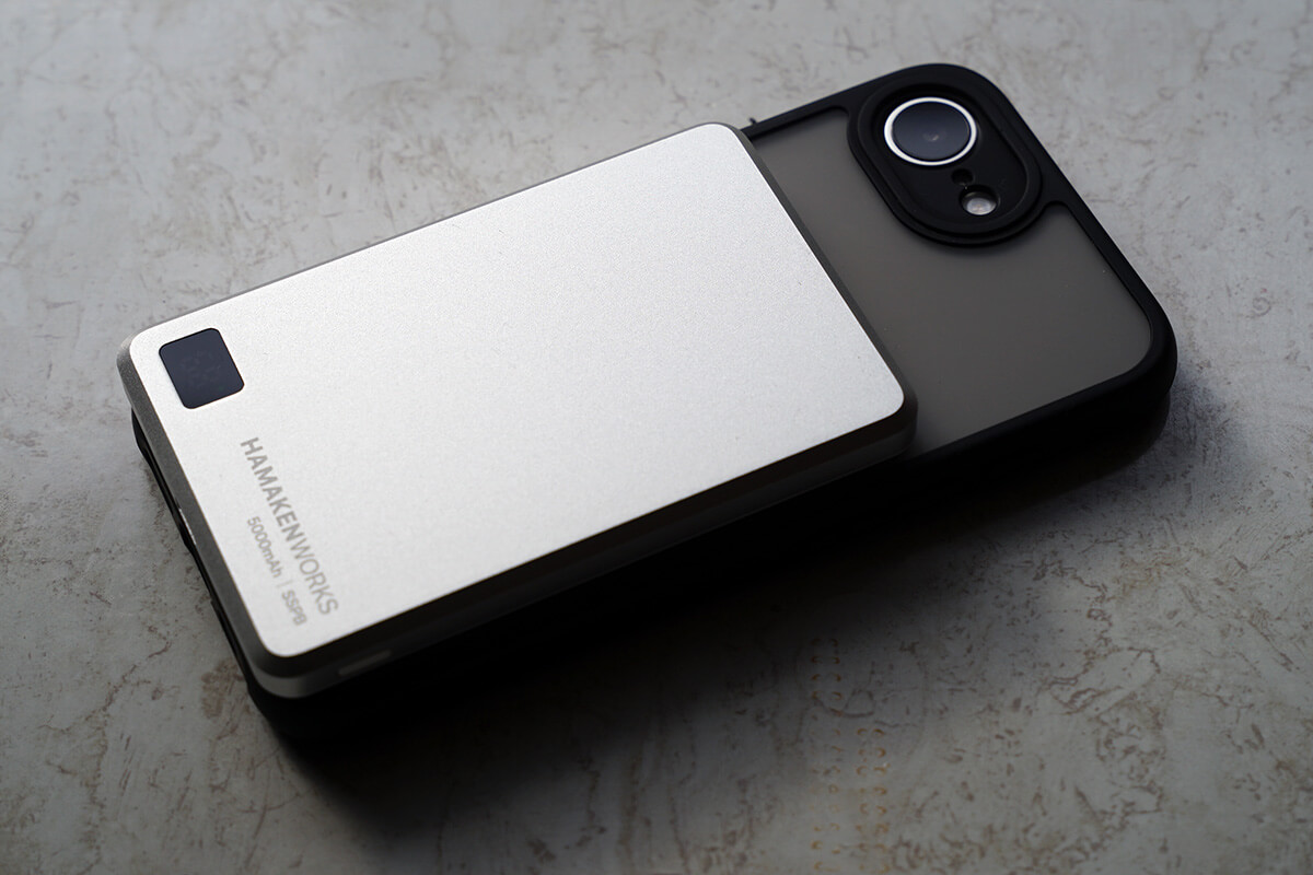 筆者はiPhone 16eを使っているのですが、活動時間帯はほとんどスマートフォンの背面に新型「SSPB」を貼り付けています。おかげで、スマートフォンの電池残量を気にする必要はありません。しかも必要な時には、常に持ち歩いている新型「SSPB」から各アイテムに電気を供給できるので、とても便利です。
