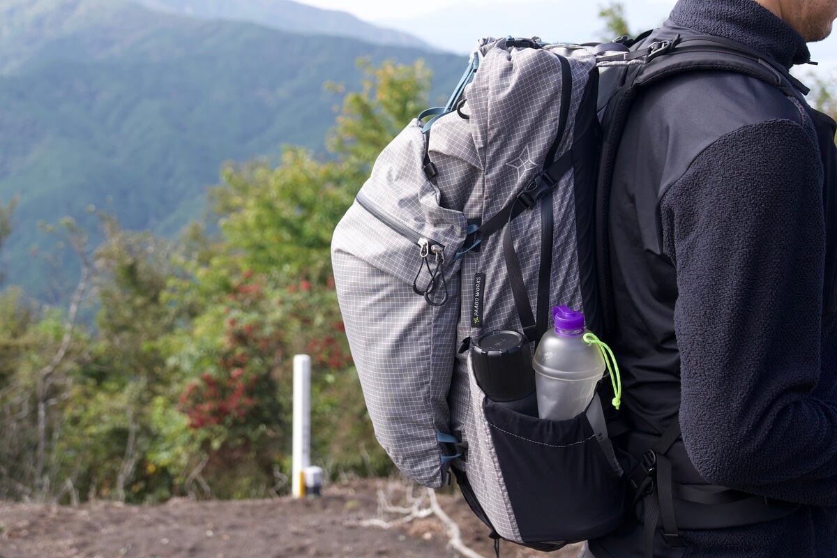 バックパックの左右に配置されたサイドポケットは、1Lほどのペットボトルが1本と500mlのペットボトルを合わせて2本収納できるほどの容量があるため、左右合わせると3Lほどのボトルを収納可能。ZENN 35にはハイドレーションを装着するためのホールがなく、基本的にはボトルを利用するしかありません。サイドポケットは体側に切れ込みが入っていることで背負ったままでもアクセスがしやすく、行動しながらでもボトルの出し入れも簡単にできるようになっています。