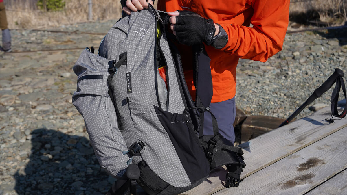 空荷の状態でもフィット感の高さを感じることができたZENN 35ですが、実際に装備をパッキングして背負ってみるとさらに背負い心地の良さを感じました。バックパックの構造が高重心になるように設計されているため、パッキングすると自然に重心が高い位置になり、さらにトップスタビライザーを使うことでしっかりと体に引き寄せ密着させることができ、荷重を肩と腰に分散させてくれることで背負いやすさは想像以上でした。