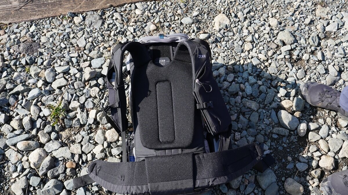 体にフィットさせることができ、快適な背負い心地のZENN 35ですが、重たい荷物を背負うことを想定した本格登山バックパックに比べると荷重分散能力や、ショルダーパットのクッション性は劣ります。