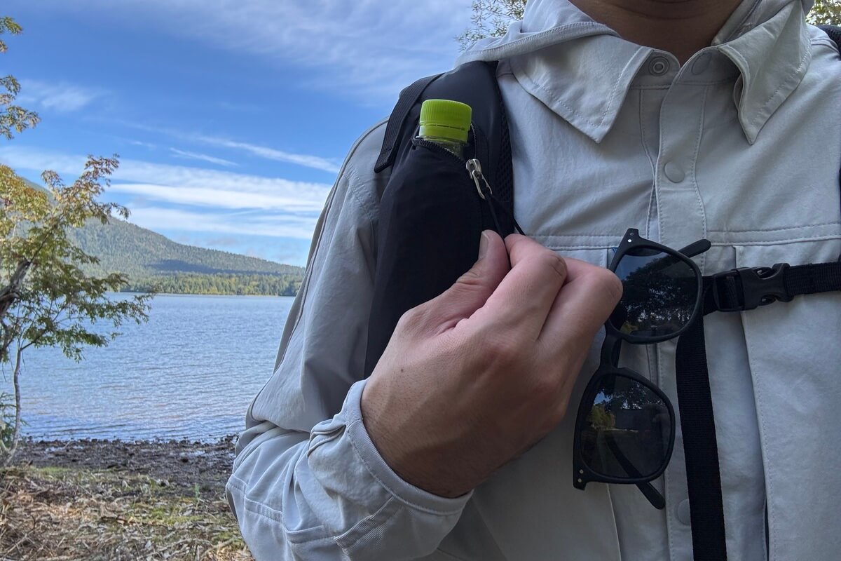 左右のショルダーベルトに設けられたポケットはパワーメッシュで伸縮性が高く、マチがついているため500mlのペットボトルを収納することもできます。ポケット状になっているため、500mlよりも大きいペットボトルを入れようとするとはみ出てるため使えるボトルは限定的ですが、容量としてはスマホを入れてもまだ余裕があり行動食なども収納でき便利でした。