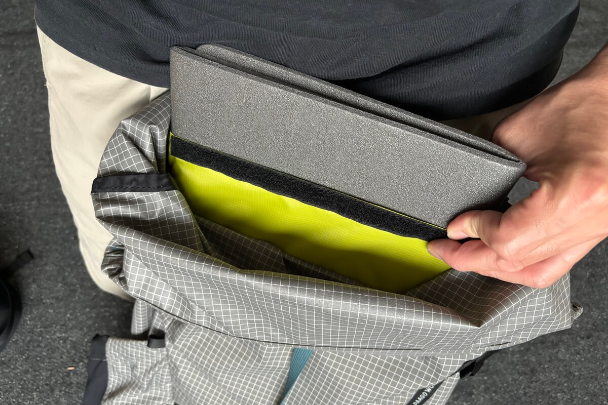 ZENN 35の総重量はメーカー公表値で1000gです。この重量は山岳用のバックパックとしてはかなり軽量な部類です。数日分の食料や装備などを背負うために作られた登山用バックパックはパッキングした際の荷重のバランスを分散するためにフレームの入っているモデルが多く、安定して背負うことができる反面、フレームの分だけバックパック本体の重量も重たくなりますが、ZENN 35にはフレームの代わりにフォームパッドが入っています。厚さ約5mmで3つ折りにされたパッドが入っていることで堅牢なフレームほどではないにせよ、パッキングしたときの安定性を高める働きをしてくれることで軽量なバックパックでありながら安定感も高くなっています。