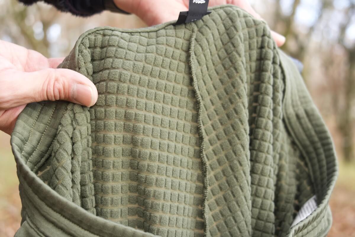 メンズ・R1 パンツの裏地にはポーラテック・パワー・グリッド が前面に使われていることで保温力と吸湿性、通気性のバランスが非常に高く、実際に履いてみるとグリッドの溝になっている部分が通気性が高いことを体感することができ、歩くとスースーします。