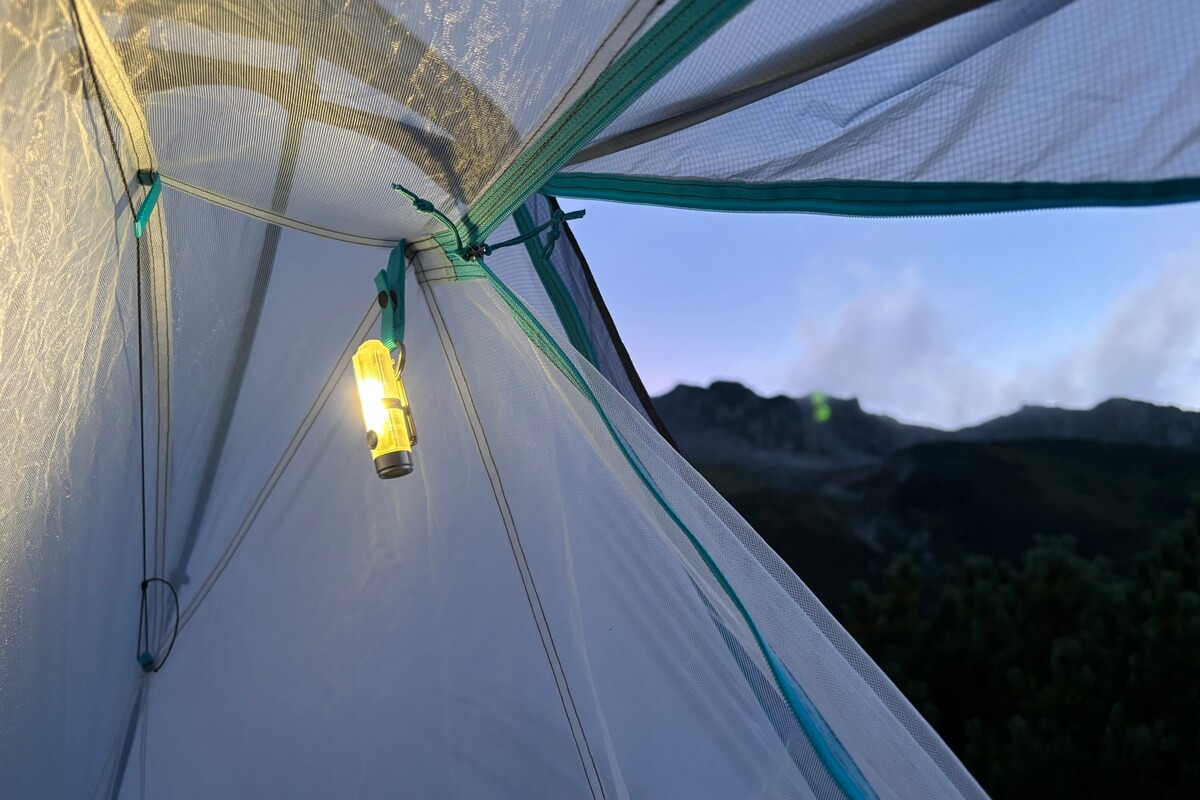 山岳シーンでの使用を想定した場合、メインのヘッドランプとして使うのは難しく、あえてヘッドランプとAurora A7の2つを持っていく必要があるかはスタイルが分かれるところかもしれません。最低限の装備でまとめるなら照明はヘッドランプ一つに担ってもらえば済みますが、ヘッドランプの電力消費を抑えたい場合や、ランタンのようにしてテント内での時間を楽しみた人にとっては軽量で魅力的なランタンといえます。今回のテストで2泊3日の北アルプス山行や1泊2日のテント泊で使ってみましたが、ヘッドランプとは別でAurora A7を持って行ったことで夕暮れのテント場で快適に過ごすことができました。