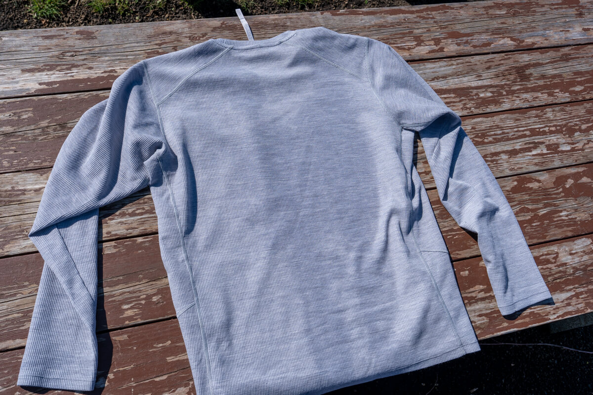 逆に言うとむき出しで着ている限り基本的にはほとんど保温性は期待できません。ただここからが「メリノウールのアクティブインサレーション」の良いところなのですが、この生地は爆通気・速乾性によって風が抜けつつも100%化繊のように水分を飛ばしきらず多少の水分と熱とを保つ(メリノウールのもつ「天然の吸放湿性による温度調節機能」)ので、身体を冷やし過ぎるということが起きにくい構造。さらに上に風を通さない生地のアウターを羽織ればたちまち保温性を発揮して身体を冷やさないようにもしてくれます。その辺の絶妙なバランスが備わっているところが素晴らしい。