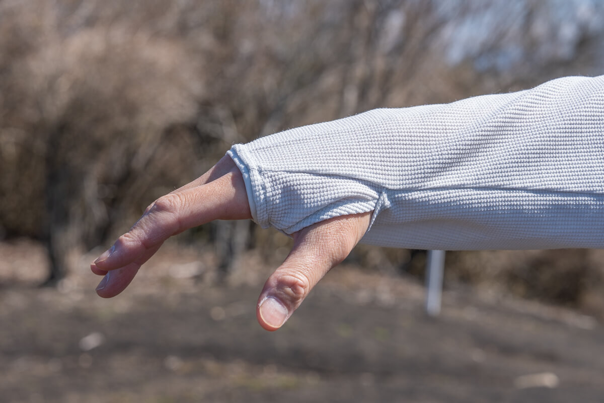 フロントファスナーの引き手がホイッスルになっており、緊急時に役立ちます(ベストとフーディに搭載)。また、視認性を高める反射材(プリント)も付いているため、暗い時間帯の活動にも適しています。さらにはサムホールで手の甲まで覆える袖口や特殊構造によるUVカット機能を備えており、夏場のうっかり日焼けも防ぎやすい。長袖は防虫対策にも有効です。