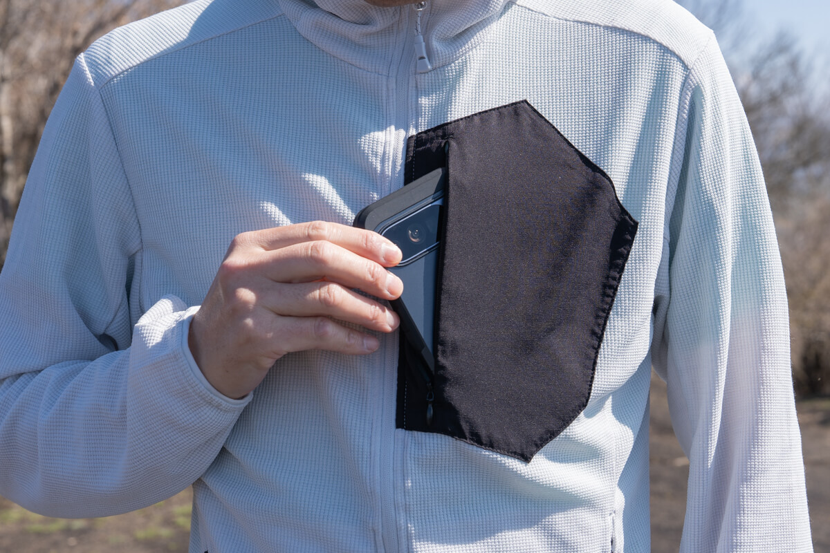 まずアウトドア用としてはやはりあって欲しい、物が落ちにくいチェストジップポケット。ここには6.8インチの大型スマホもしっかりと入ります。フーディモデルでは左右の(ベンチレーションにもなる)ジップポケットと、最低限の収納が確保されています。
