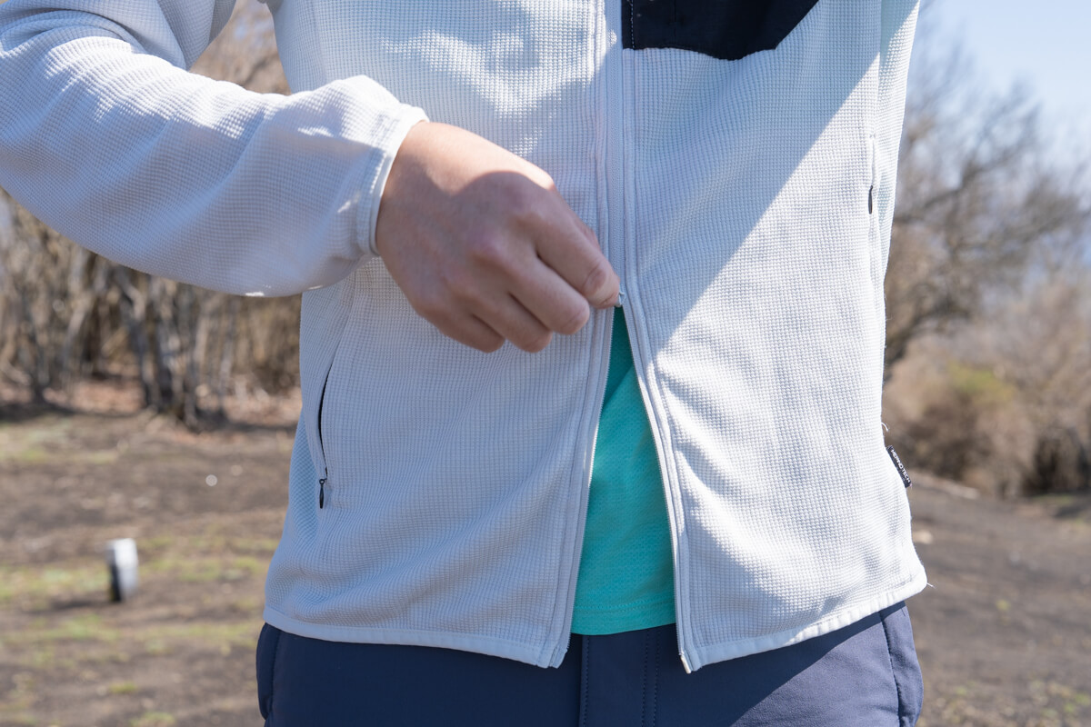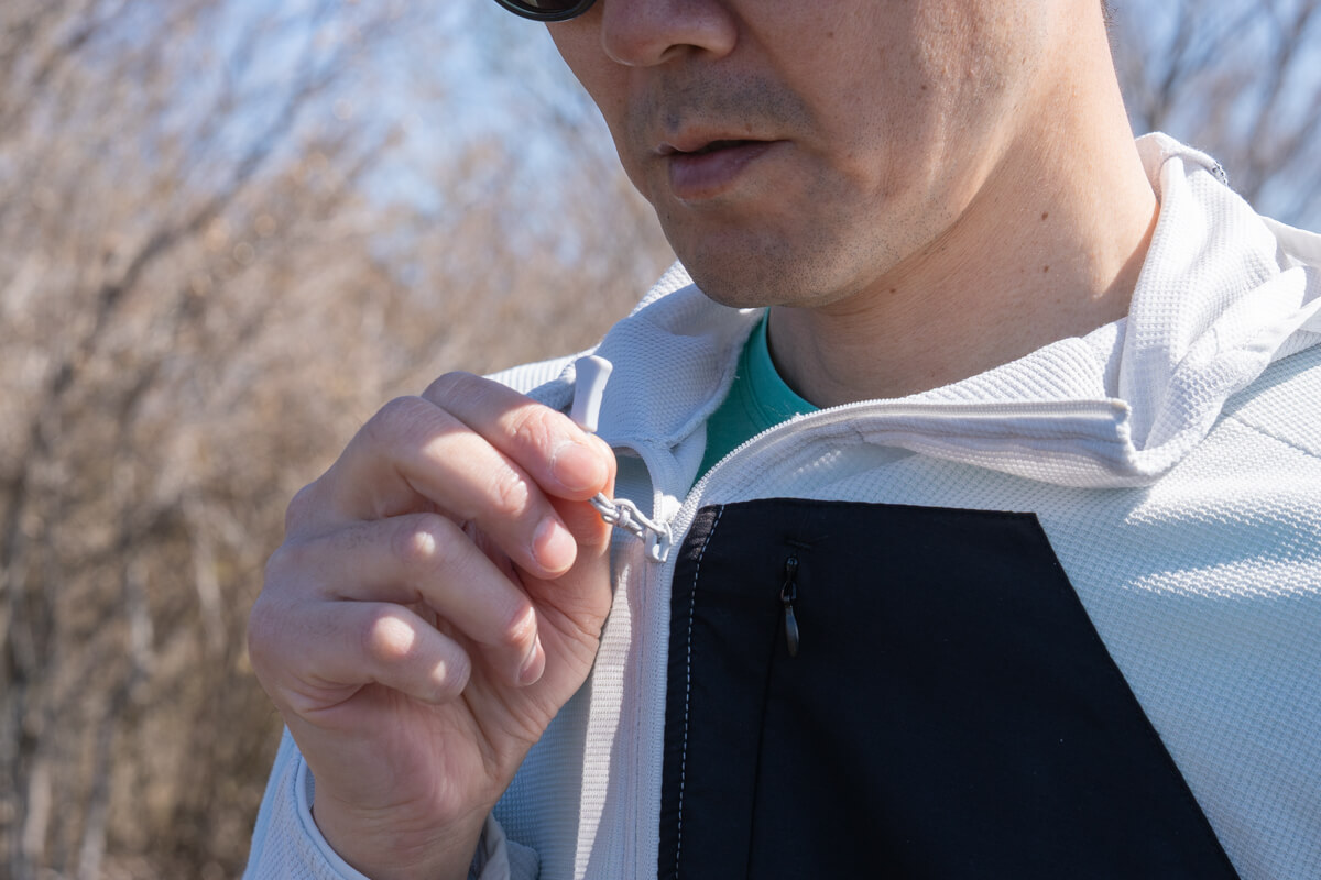ちなみにフーディモデルでは上下から開けられるダブルファスナーや、ベンチレーション(換気)として機能するメッシュ構造のポケットが採用されており、細部まで通気性に配慮されている点も忘れてはなりません。
