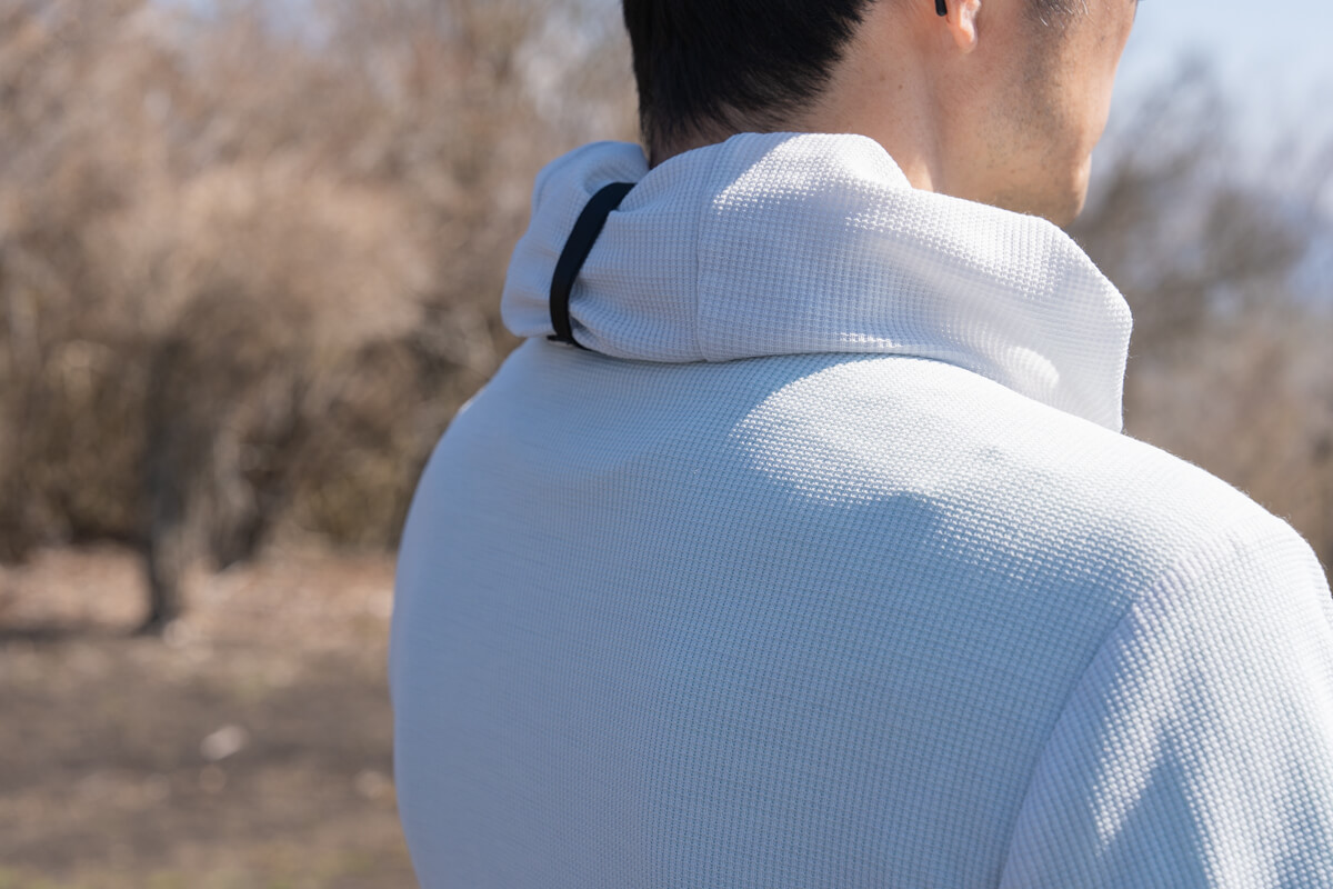 フーディタイプはフロントダブルジッパーでより温度調節がしやすく、また頭にフィットしやすいバラクラバ式のフードは丸めて留められる2WAY仕様で、風でバタついたり邪魔になったりするのを防げます。
