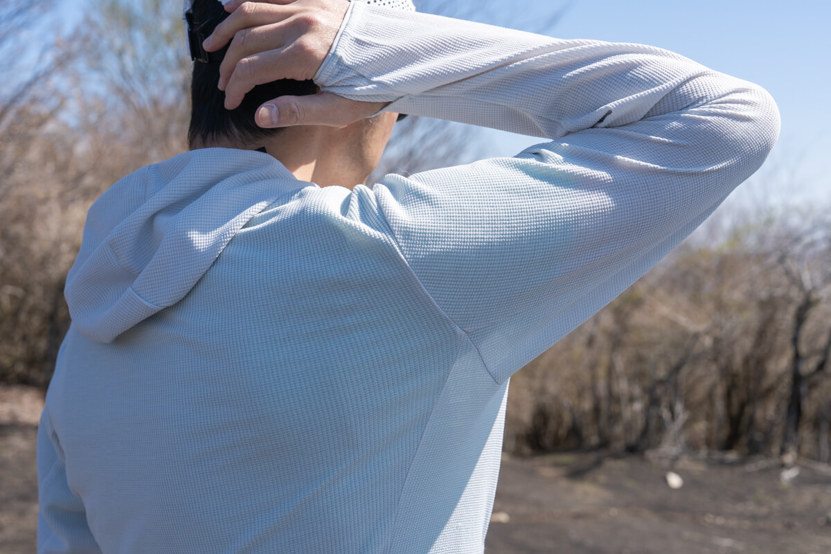 着心地は相変わらずイカついネーミングとは裏腹に甘くて柔らかい。着ている感覚を忘れさせるほどの軽さに、肌にしっとりでなく「ふわっと」空気と共に優しく触れる感じがどこまでも爽やか。そして緩く編まれた生地は想像した通り優れたストレッチ性を備えており、ややタイトめで体にフィットするデザインでありながらも、窮屈感とは皆無のリラックス感のある着心地を実現しています。また行動時に腕上げや腿上げをしてもストレスが限りなく少ない可動域が確保されたパターンになっているので動きやすさは抜群です。まるで何も着ていないかのような軽やかさ(Lサイズで約250g)も、アクティビティ中の負担を軽減してくれます。