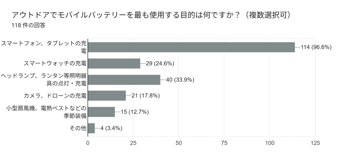 アウトドアでモバイルバッテリーを最も使用する目的は何ですか?(複数選択可)