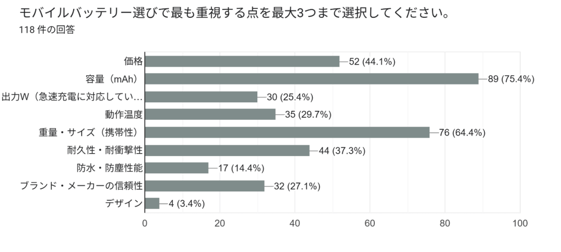 モバイルバッテリー選びで最も重視する点を最大3つまで選択してください。
